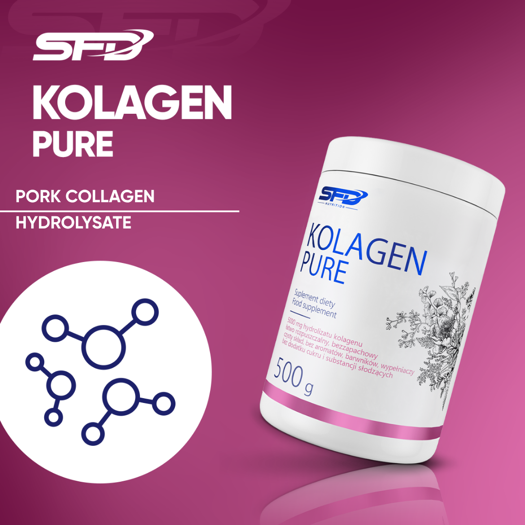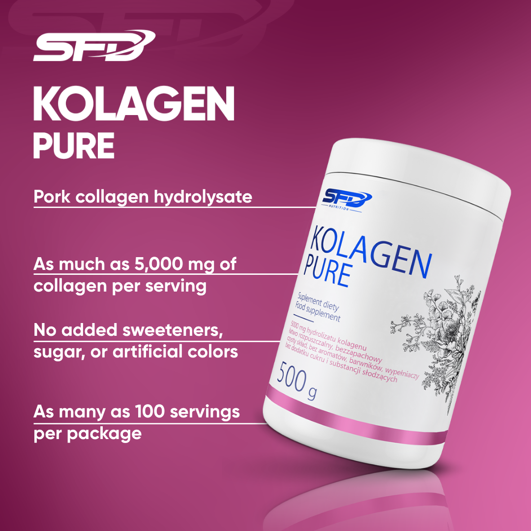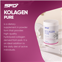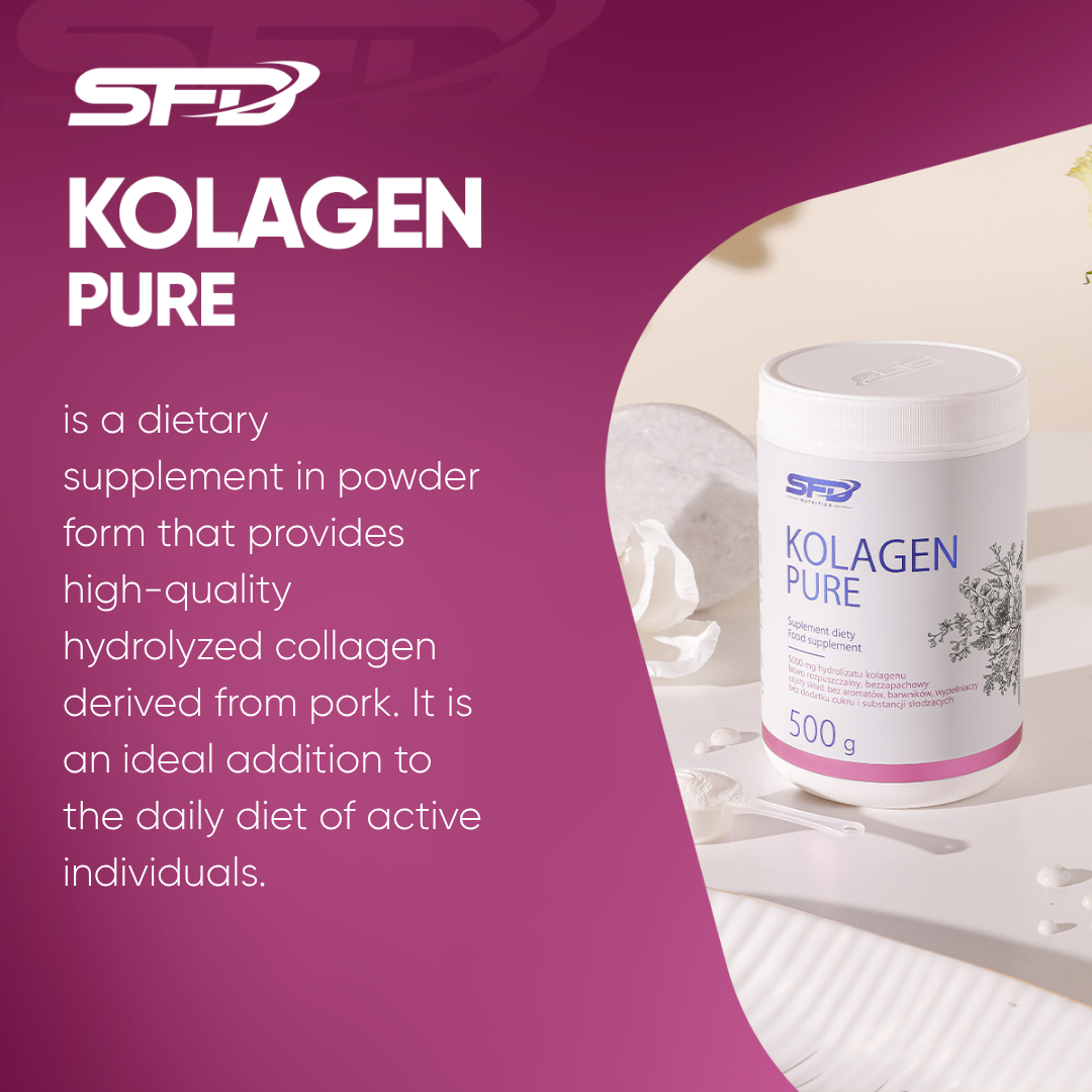 SFD PURE COLLAGEN is a powdered dietary supplement based on hydrolysed porcine collagen, dedicated to people who care about the healthy appearance of their skin, as well as to people who play sports, after sports injuries, during the recovery period. The product consists of 100% hydrolysed collagen, without unnecessary additives, sugar and fillers.