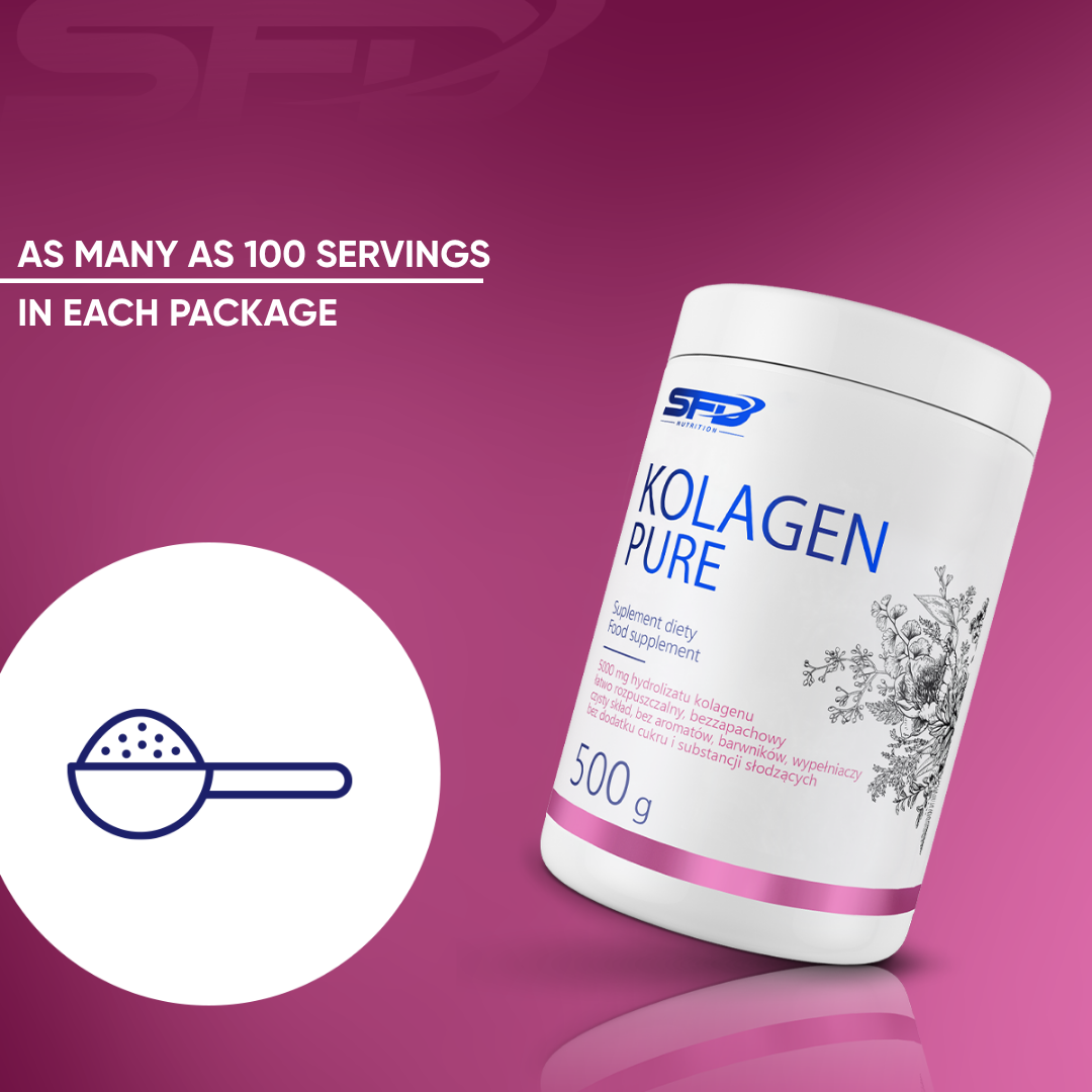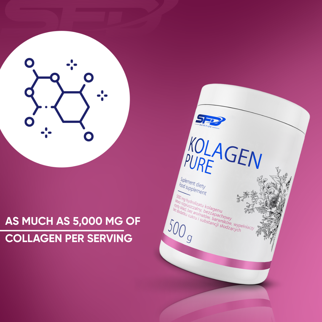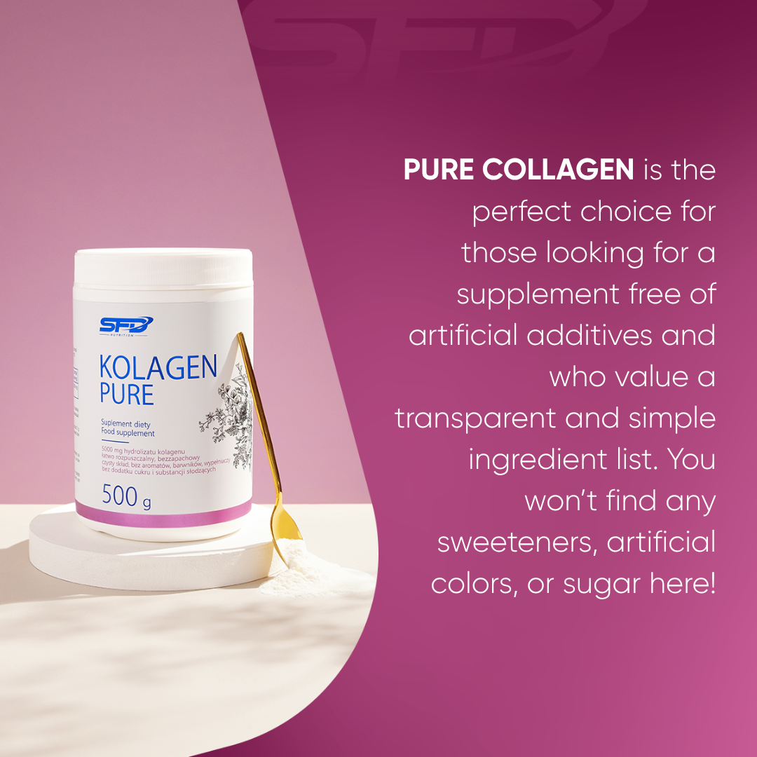 SFD PURE COLLAGEN is a powdered dietary supplement based on hydrolysed porcine collagen, dedicated to people who care about the healthy appearance of their skin, as well as to people who play sports, after sports injuries, during the recovery period. The product consists of 100% hydrolysed collagen, without unnecessary additives, sugar and fillers.
