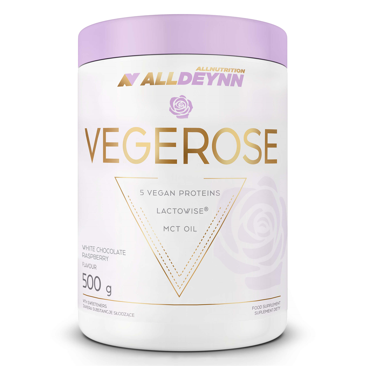 ALLDEYNN VEGEROSE is a high-protein drink supplement based on a premix of five plant proteins; pea protein isolate, rice protein concentrate, cranberry protein concentrate, almond protein concentrate, and hemp protein. It has been enriched with the branded probiotic-prebiotic complex LactoWise®, acacia fiber, flaxseed, and MCT oil.