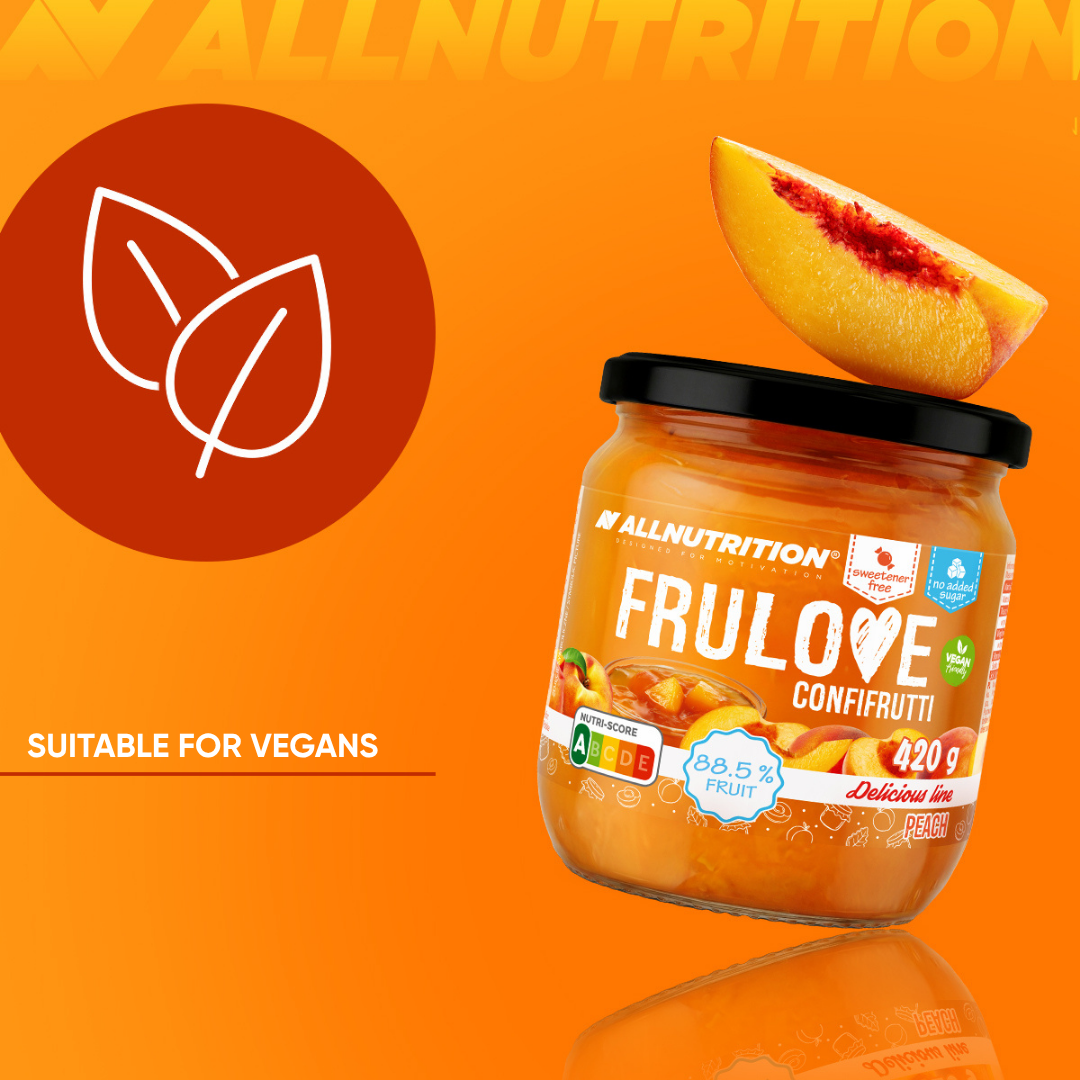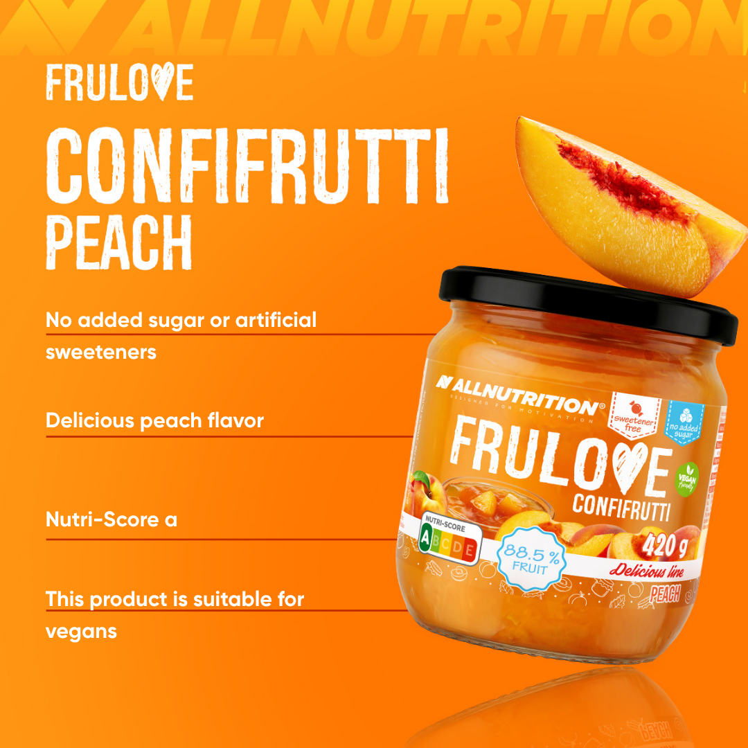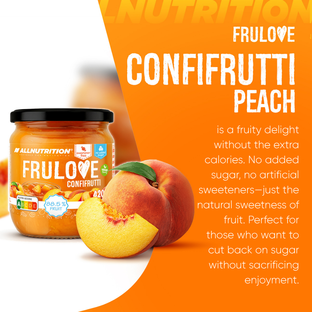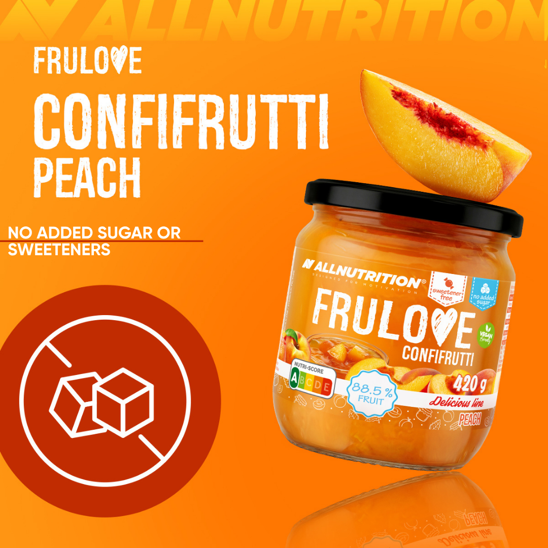 ALLNUTRITION FRULOVE CONFIFRUTTI PEACH is the true essence of fruit, with sweetness coming exclusively from the fruit itself. It is the perfect choice for those who care about ingredients and taste! FRULOVE CONFIFRUTTI PEACH is a delicious peach addition to your meals.