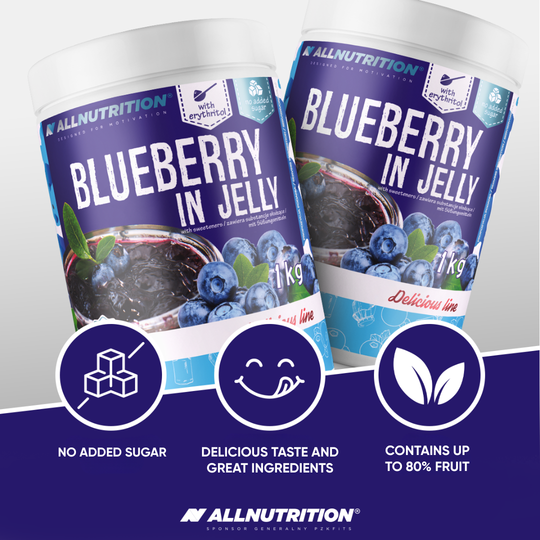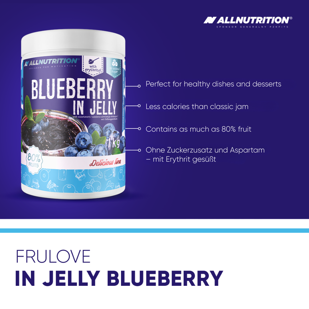 ALLNUTRITION FRULOVE IN JELLY BLUEBERRY is a delicious sugar-free fruit jam with whole blueberries, with a fruit content of up to 80%! It was created for all those who want to take care of their figure without giving up a little sweet pleasure in their diet.