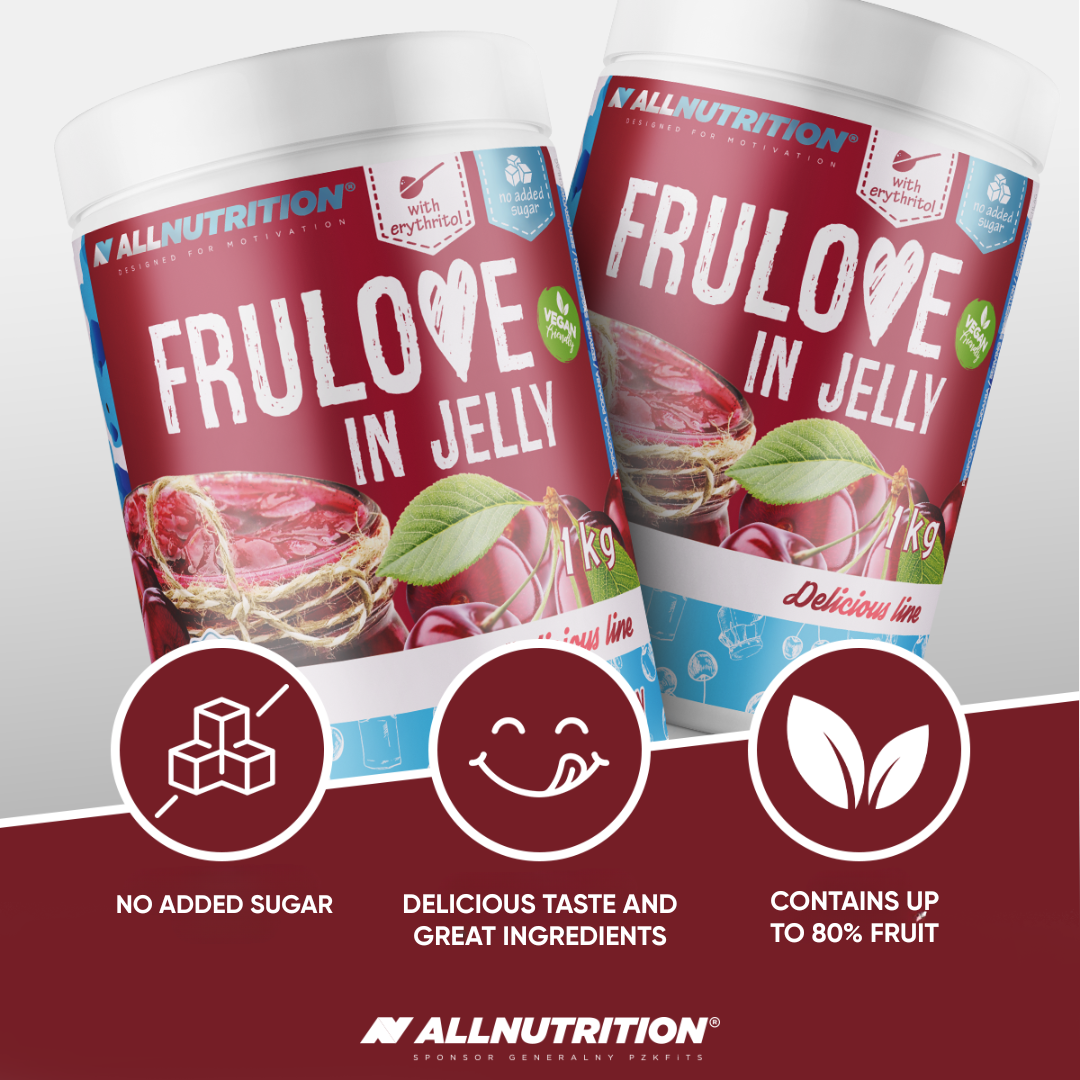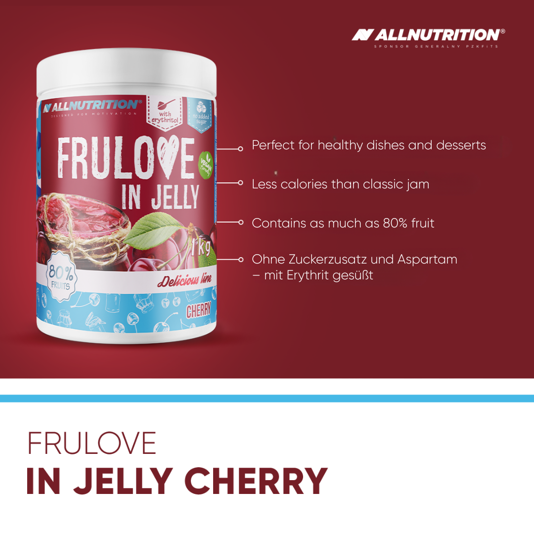 ALLNUTRITION FRULOVE IN JELLY CHERRY is a delicious sugar-free fruit jam with whole pieces of cherries and an 80% fruit content! It was created for all those who want to take care of their figure without giving up a little sweet pleasure in their diet.