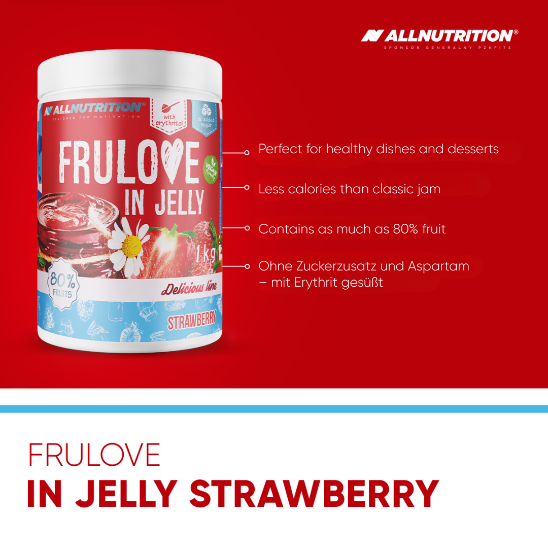 ALLNUTRITION FRULOVE IN JELLY STRAWBERRY is a delicious sugar-free strawberry fruit jam with whole strawberry pieces. It is designed for all those who want to take care of their figure without giving up a little sweet pleasure in their diet.