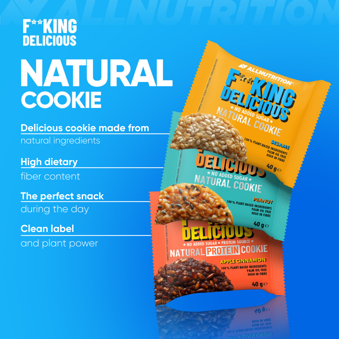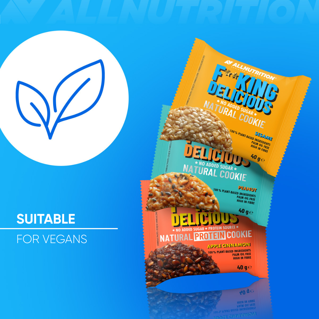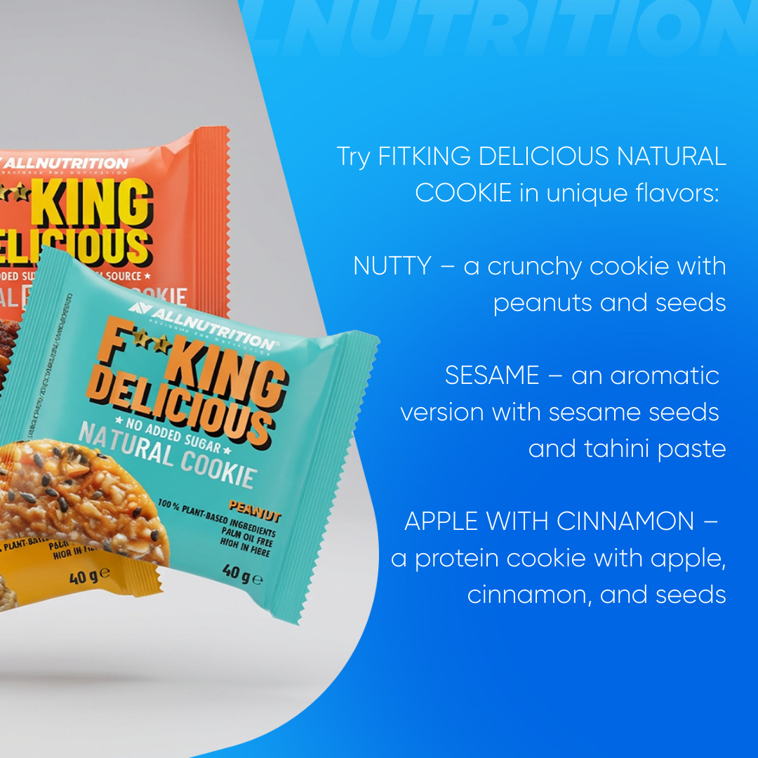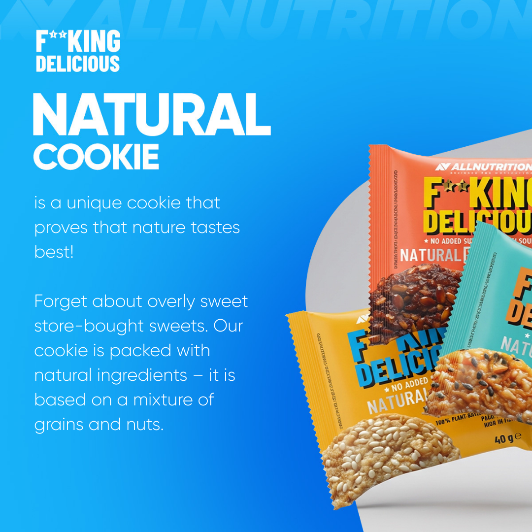ALLNUTRITION FITKING DELICIOUS NATURAL COOKIE is a unique cookie that proves nature tastes best! Forget about overly sweet store-bought sweets. Our cookie is a bomb of natural ingredients – based on a blend of grains and nuts. It is the perfect choice for people who care about their diet, vegans, and anyone looking for a crunchy snack without guilt.
