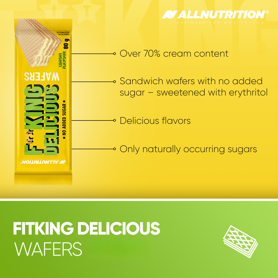 ALLNUTRITION FITKING DELICIOUS WAFERS are incredibly delicious, cream layered waffles with no added sugar! The package contains 2 servings, each consisting of 4 wafers layered with cream in cocoa, cream or nut flavors. Without any remorse, you can munch it with your coffee or snack after a workout! :)