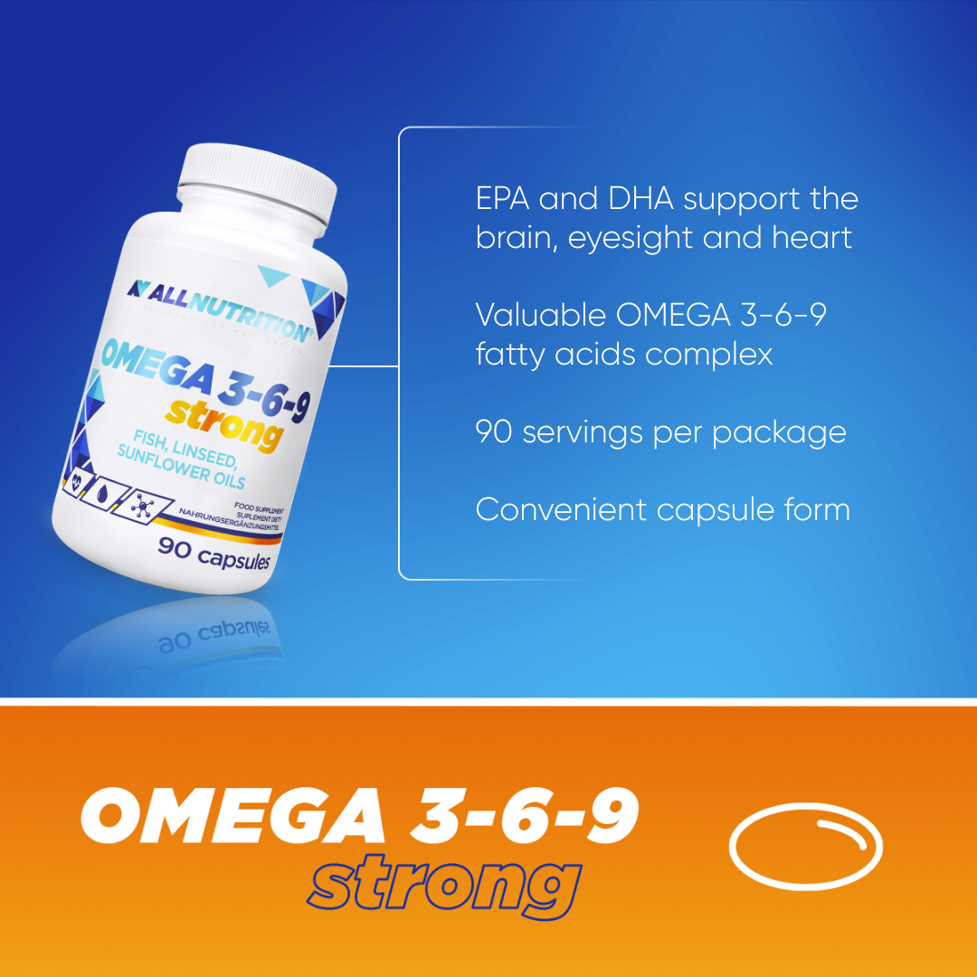 ALLNUTRITION OMEGA 3-6-9 STRONG is a food supplement containing a composition of fish oil from linseed and sunflower oil, which provide omega 3, 6 and 9 in a strong version.