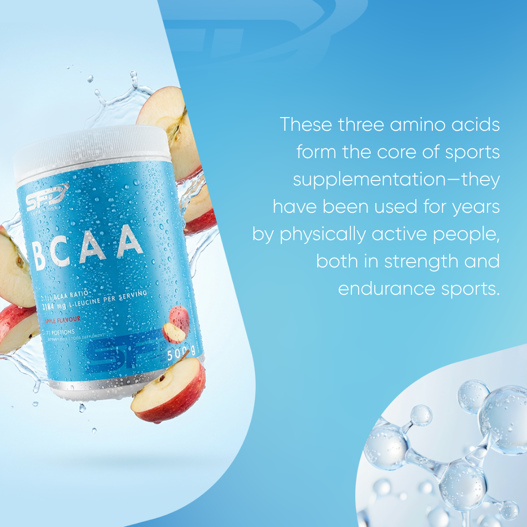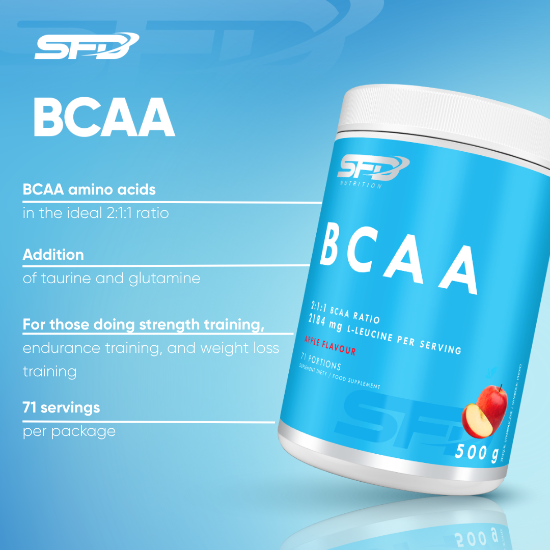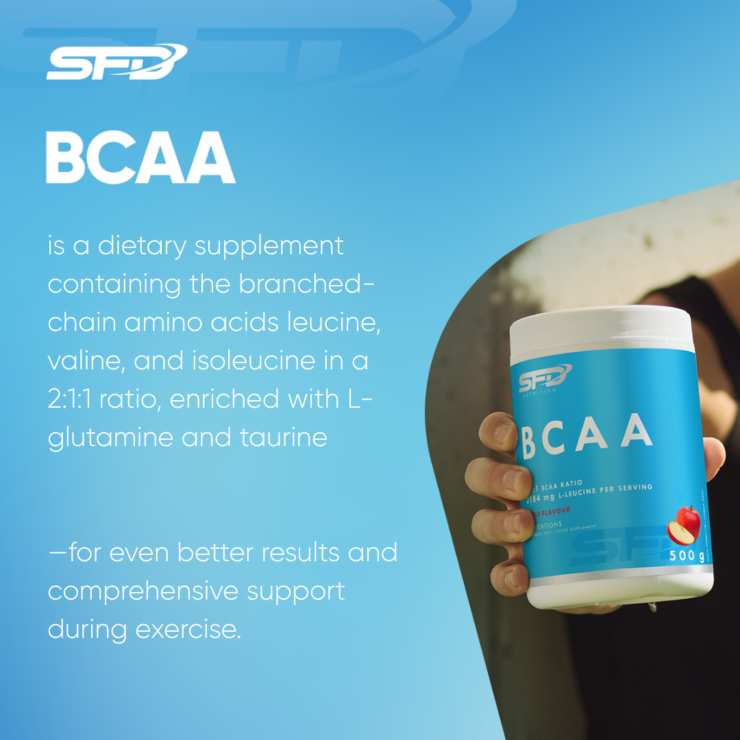 SFD BCAA is a dietary supplement containing branched-chain amino acids: leucine, valine and isoleucine in a 2:1:1 ratio, enriched with l-glutamine and taurine – for even better performance and comprehensive support during exercise.
