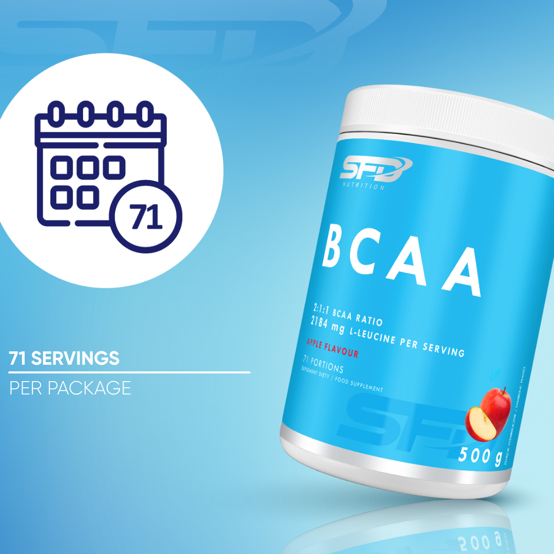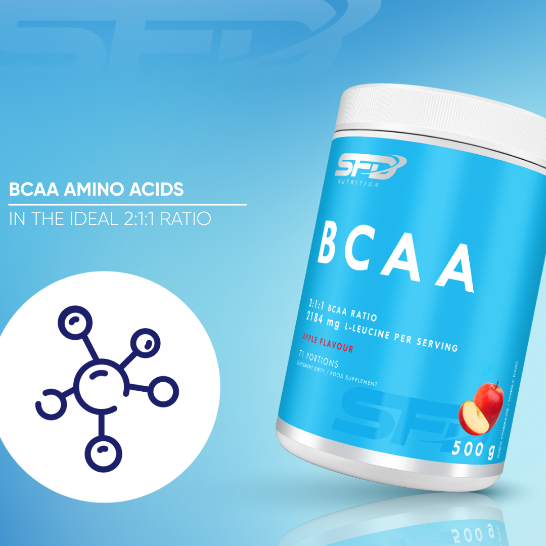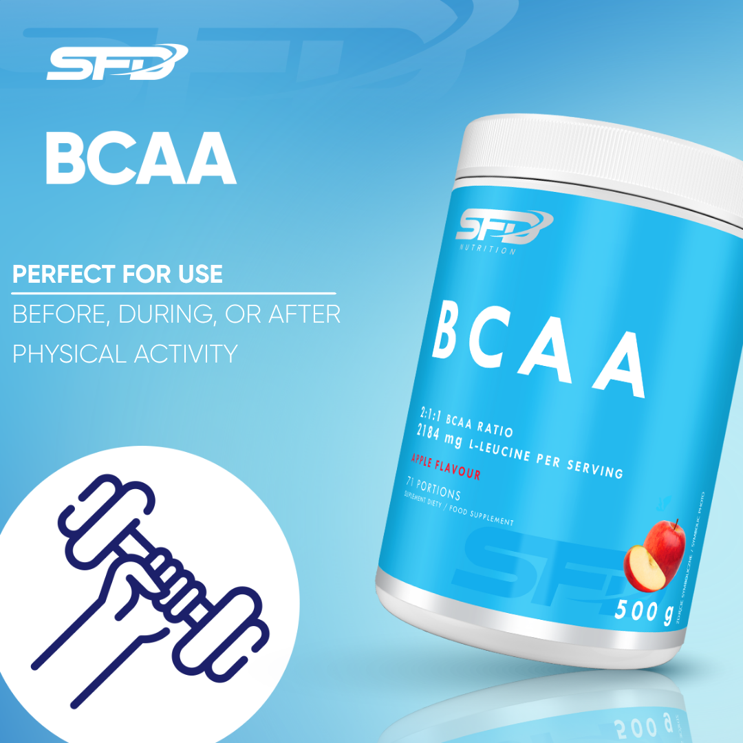 SFD BCAA is a dietary supplement containing branched-chain amino acids: leucine, valine and isoleucine in a 2:1:1 ratio, enriched with l-glutamine and taurine – for even better performance and comprehensive support during exercise.